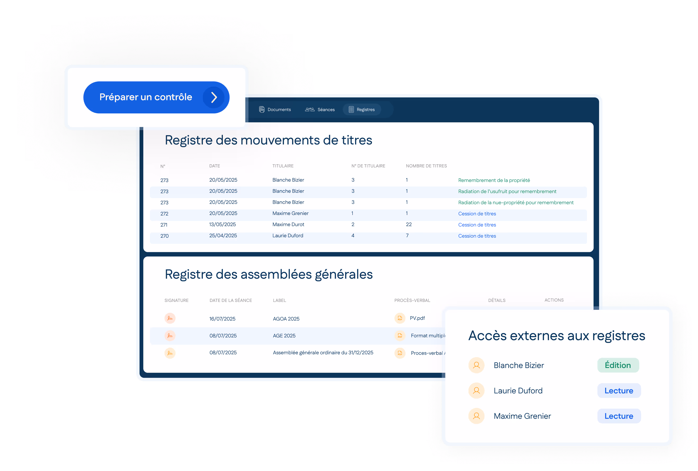 Ubikap vous permet de créer, mettre à jour et gérer l'ensemble des registres légaux.