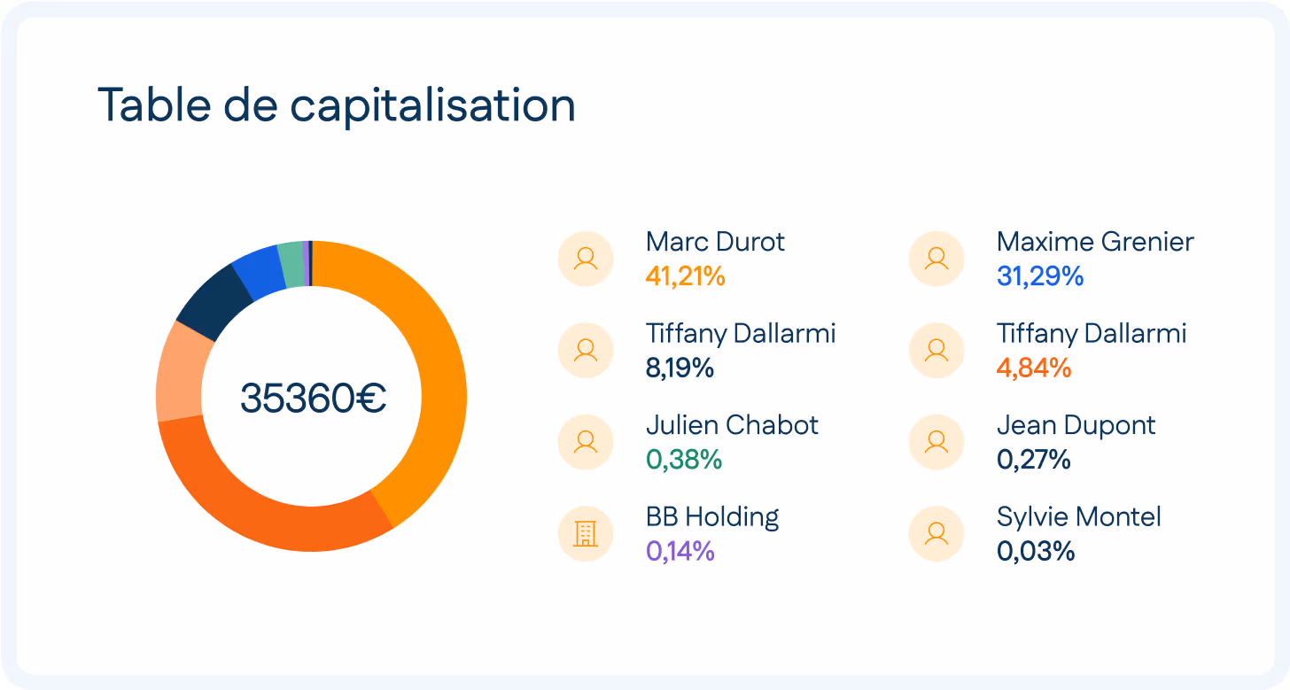 Avec Ubikap, les fiches actionnaires et la table de capitalisation se mettent à jour automatiquement à chaque mouvement de titres. Vous visualisez en temps réel la répartition du capital, et l'historique des opérations.